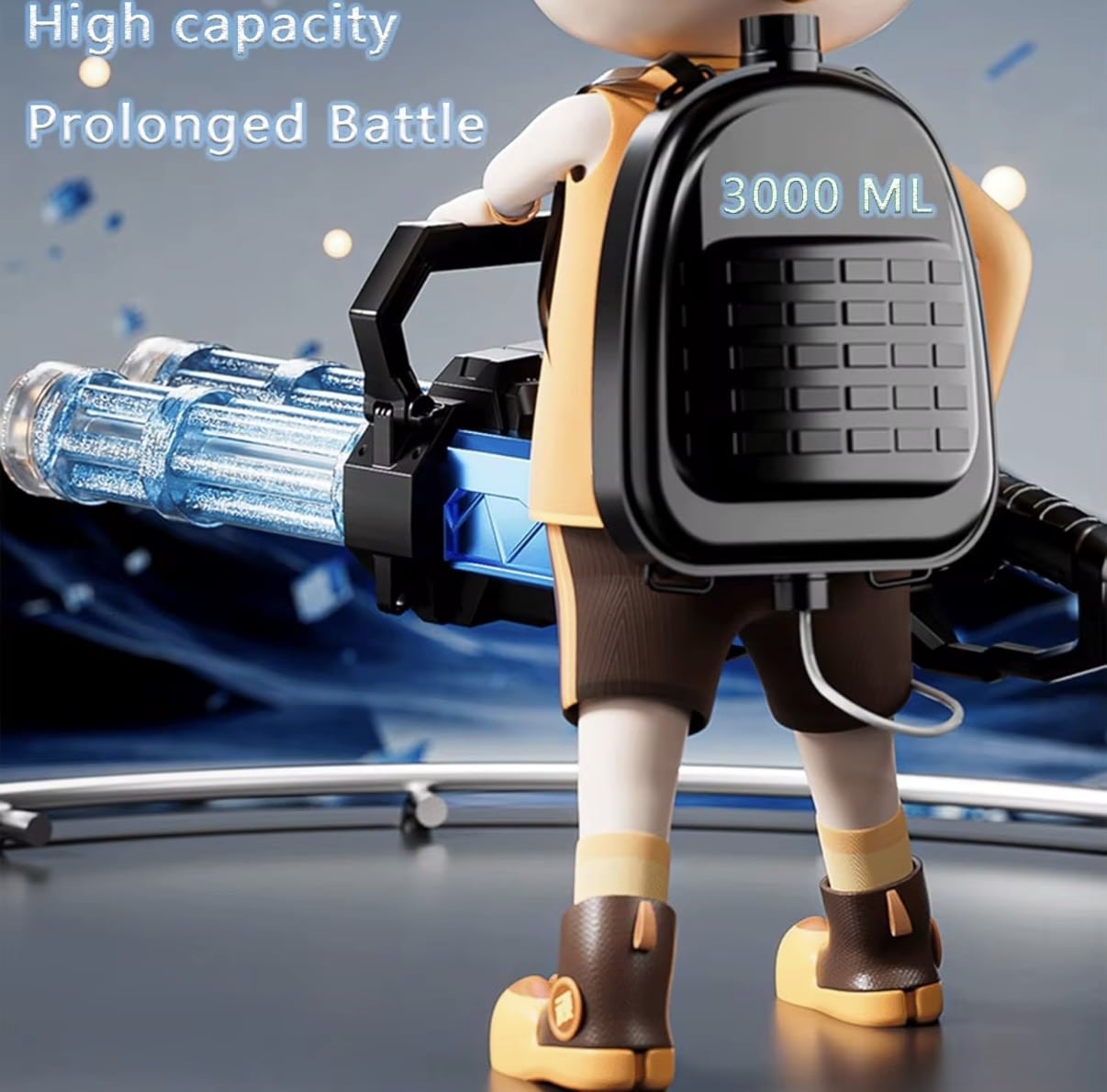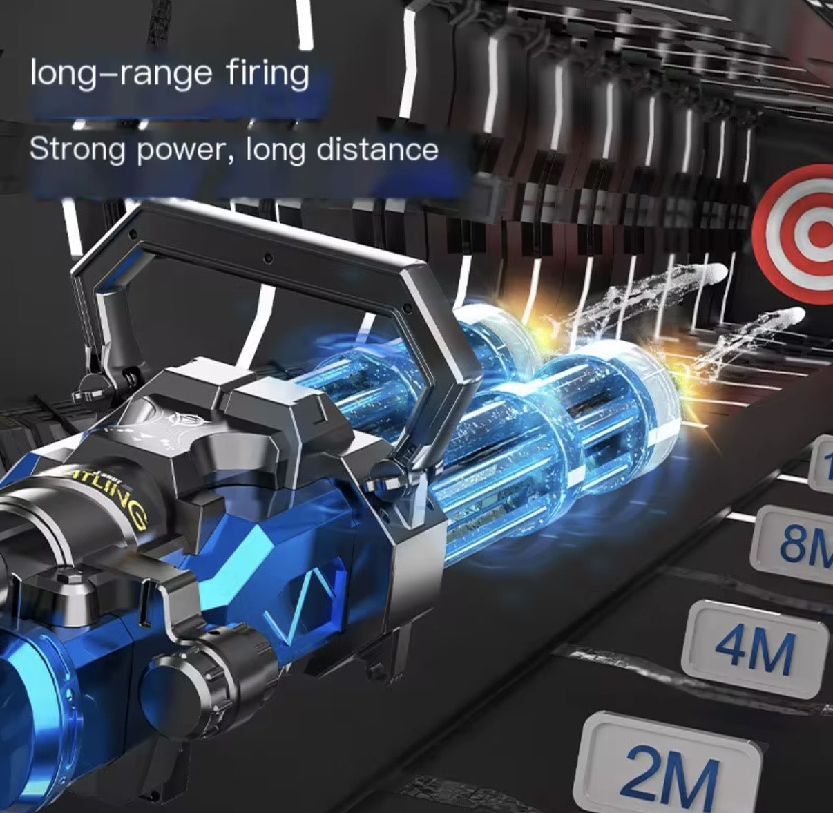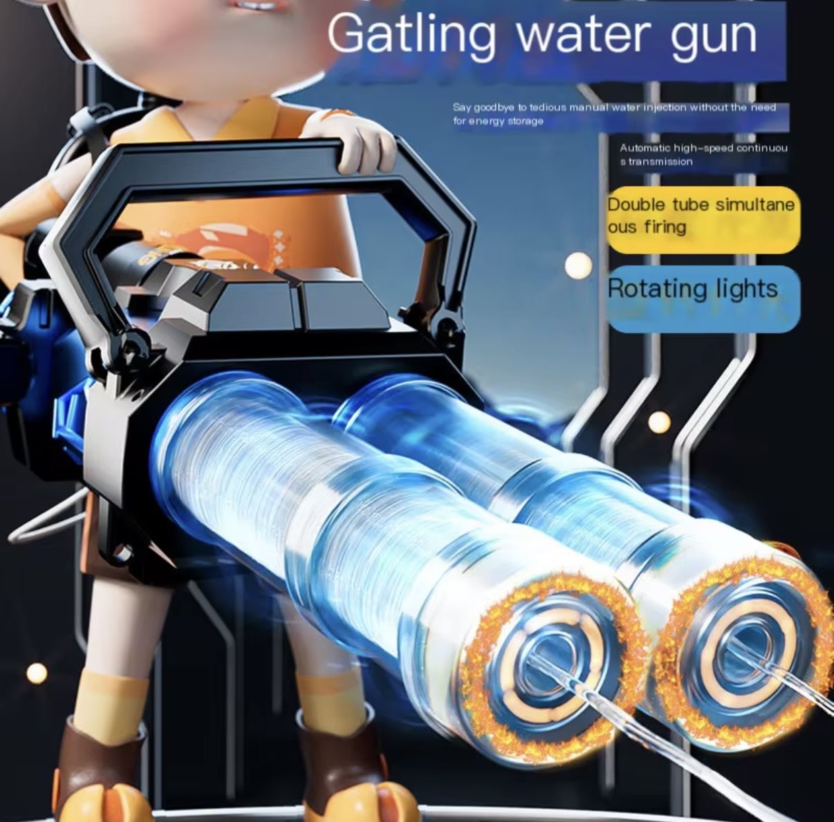 Leg og bevægelse i sommerperioden. Dobbeltløbet Gatling elektrisk vandkanon er udviklet til udendørs leg med vand og er beregnet til brug i private omgivelser som have, gårdhave eller strand. Produktet anvendes som legetøj og giver mulighed for aktiv leg i varme perioder. Vandkanonen er konstrueret som en håndholdt, elektrisk enhed med dobbelt løb og aktiveres via elektronisk funktion. Den er designet til brug af børn fra 8 år og skal anvendes under opsyn i overensstemmelse med de medfølgende instruktioner.