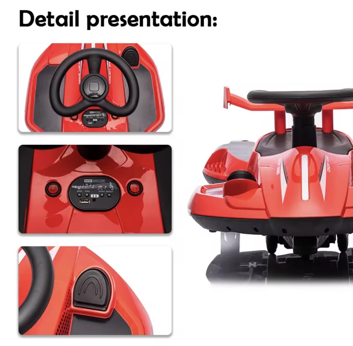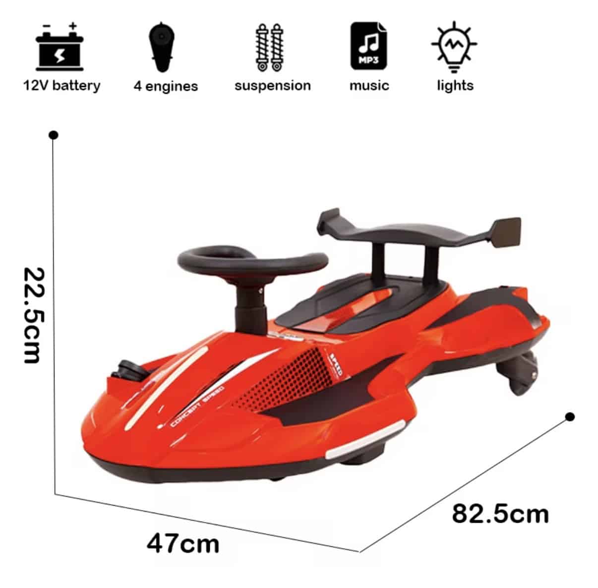Denne elektriske ride-on car er udviklet som legetøj til børn og er beregnet til brug i private omgivelser som have, gårdhave eller lignende områder. Produktet giver mulighed for leg og bevægelse, hvor barnet selv styrer kørslen i et roligt tempo. Ride-on bilen er batteridrevet og udstyret med funktioner, der understøtter legeoplevelsen. Der kan tilsættes vand i den integrerede vandfunktion, som under brug skaber en synlig røg-effekt fra to bagudvendte udstødningsåbninger. Effekten er en visuel del af legen og er baseret på vand.