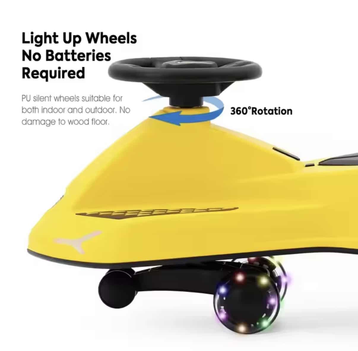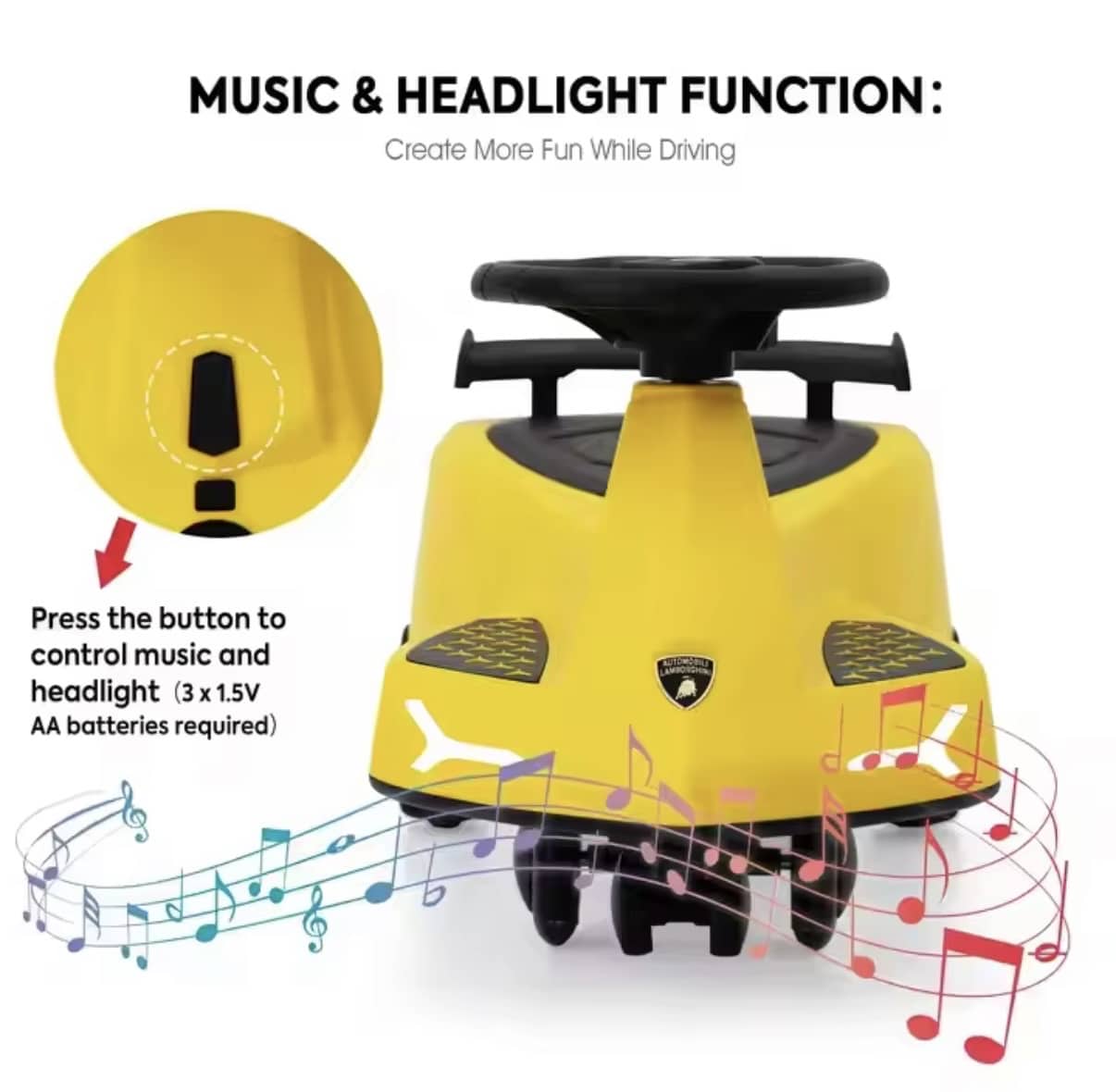 Gør legen endnu sjovere med denne eksklusive Lamborghini sving bil til børn. Designet med det ikoniske Lamborghini-look kombinerer den fart, sjov og komfort på en helt ny måde. Bilen har 360° drejebar styring, så barnet nemt kan navigere rundt, og de støjsvage PU-hjul gør den ideel både til indendørs og udendørs brug – uden at ridse gulve. For ekstra sjov har bilen indbyggede LED-lys i hjulene, der blinker under kørsel, samt musik- og lysfunktion i fronten, som aktiveres med en knap på rattet. Den ergonomiske siddeplads, det stabile design og de let kørende hjul sikrer en komfortabel og sikker oplevelse. Et perfekt valg til små fartglade børn, der vil opleve ægte Lamborghini-stil.